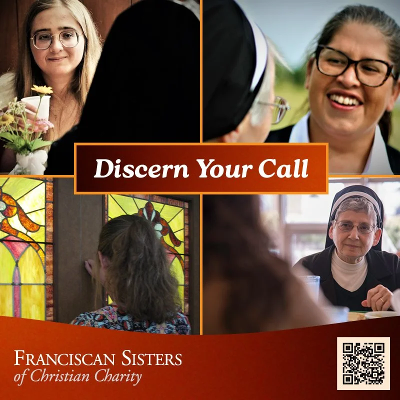 Collage of four women in different settings including a woman with flowers, two women smiling and talking, a girl looking at stained glass, and a nun at a table, with a central banner reading "Discern Your Call" and bottom text "Franciscans Sisters o